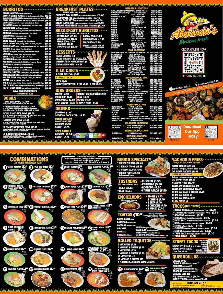 If you're craving bold flavors and fresh ingredients, Abelardo’s Mexican Fresh Menu is the perfect spot to satisfy your hunger. Located at 811 N 205th St, Elkhorn, NE, this vibrant eatery offers a mouthwatering selection of Mexican dishes made with the finest ingredients. From sizzling fajitas to perfectly seasoned tacos, each dish is crafted to deliver that authentic taste you’ve been searching for. The menu is full of delicious choices, from savory burritos to fresh salads, all designed to satisfy every craving. Whether you’re in the mood for something light or looking to indulge, there’s something for everyone. Every bite bursts with flavor, making it easy to see why Abelardo’s is a local favorite. So, grab a seat and dive into a menu that promises nothing but the best in Mexican cuisine.